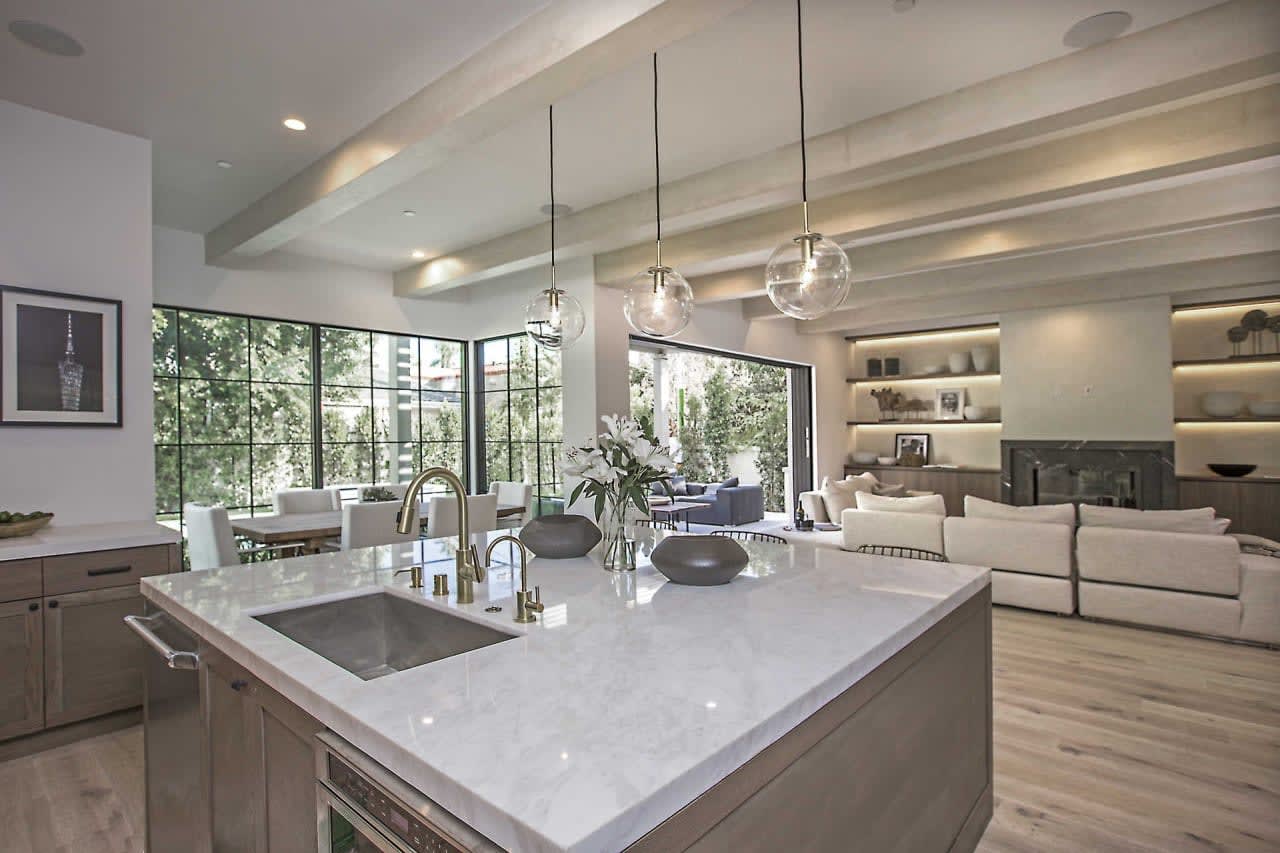 Equally of-the-moment? Kitchens that double as informal living and dining spaces. Anyone who’s ever thrown a party knows guests always gravitate toward the kitchen, so builders are making it part of the living experience. “Large kitchens that open to the family room are a huge plus for the functionality of the modern family,” David adds. Home builders are taking heed, designing expansive, open kitchens that provide family members and guests a place to congregate without disturbing the chef. 916 N. Serrano Ave., a newly reimagined 1927 home in Los Feliz represented by Josh Myler, echoes this sentiment. While the home still offers a traditional formal dining room, its open kitchen and family room with sliding pocket doors to an outdoor lounge embrace a more laid-back, modern lifestyle, encouraging movement and conversation.
