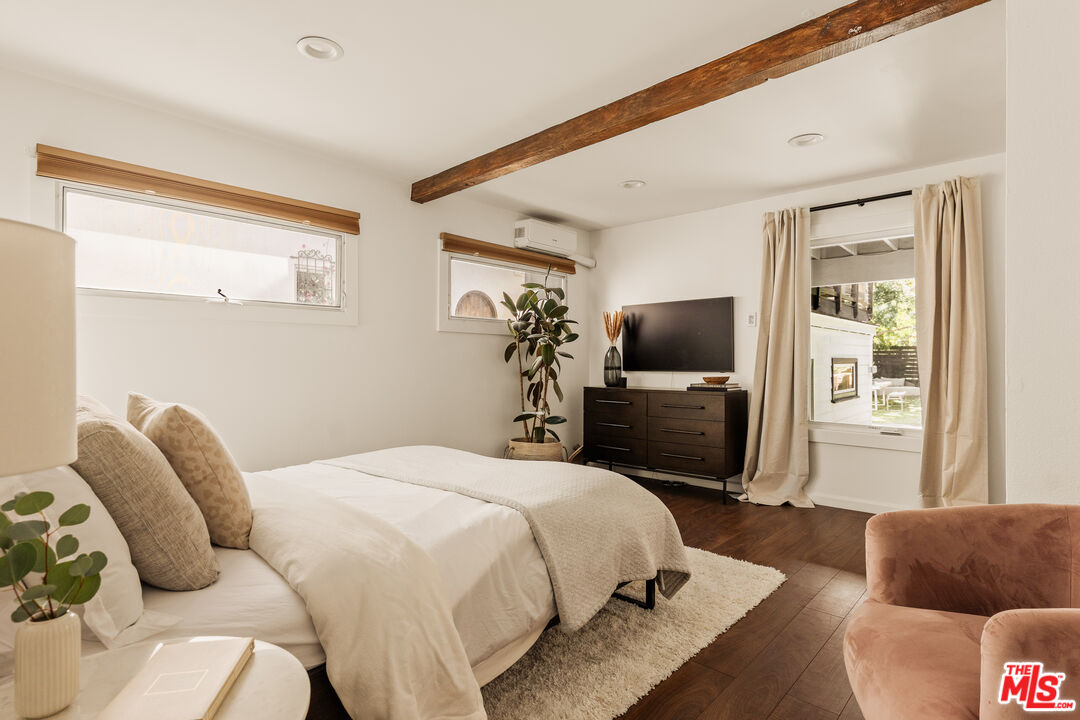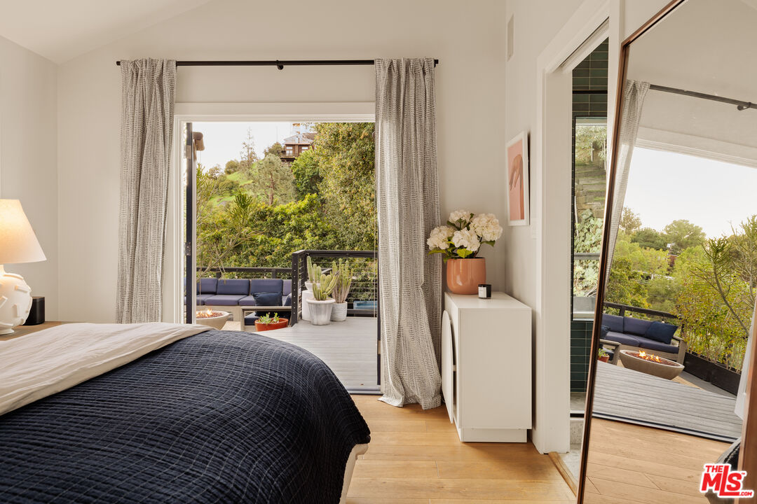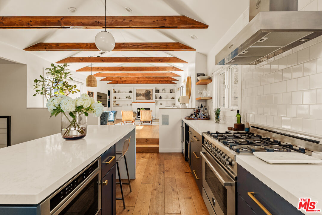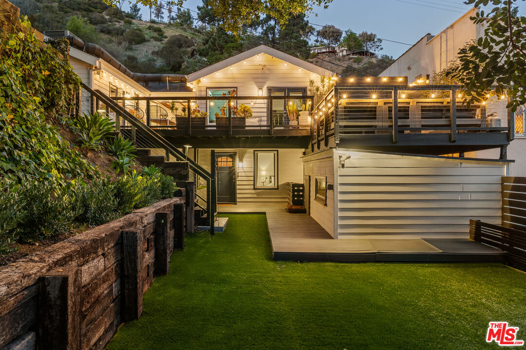 Beautifully updated hideaway perched at the top of the Kirkwood Bowl in Laurel Canyon. Located in one of Los Angeles County's best school districts (Wonderland Elementary), this 3-bed, 3-bath California bungalow offers the quintessential Southern California lifestyle. The main living area is a voluminous space accentuated by high wood-beamed ceilings and includes a fully equipped chef's kitchen featuring a Bertazzoni range, wine fridge, and a large island perfect for entertaining; an open dining area; and an elegant, stylish living room. The main floor is rounded out by a guest bedroom/office with an ensuite bath and a primary suite, each opening through French doors to the private back deck, outdoor dining area, and sunken lounge with fire pit all boasting gorgeous treetop and city-light views. The lower level includes a laundry area and a charming third guest suite with a separate private entrance that opens to an expansive lawn, private hot tub, and a second outdoor dining area.Whether entertaining large groups under the stars or unwinding in your private spa beneath the canopy of mature trees, this rare jewel box offers something for everyone.